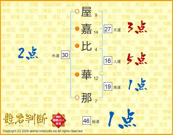 屋(9画)嘉(14画)比(4画) 華(12画)那(7画)