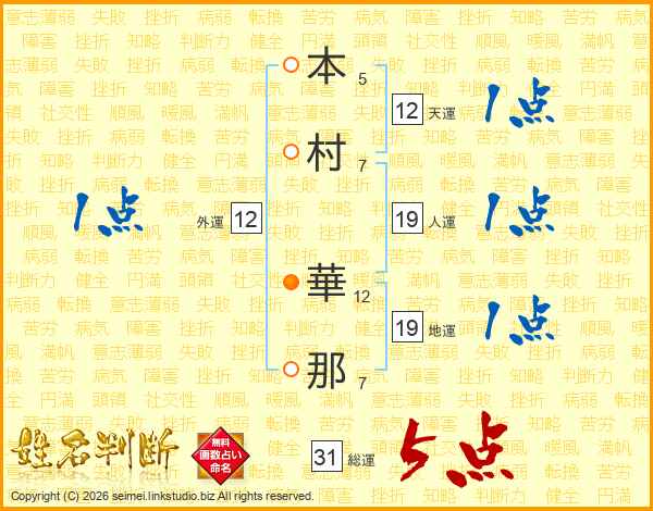 本(5画)村(7画) 華(12画)那(7画)