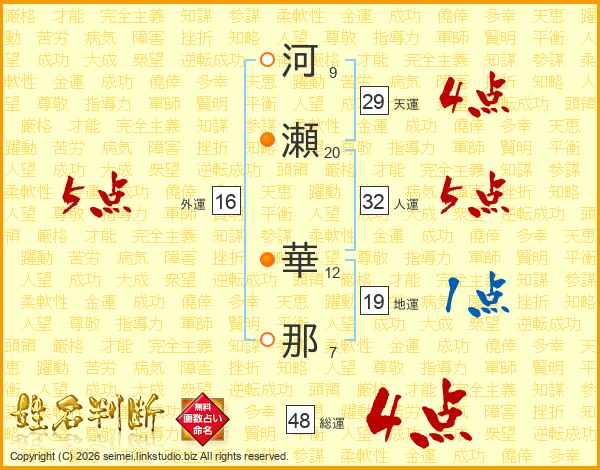 生活面を象徴する運勢です。外部から受ける影響力を表し、結婚運、家庭運や職場、環境への順応性を表します。総運から人運を引いた画数。姓や名が1文字の場合を除く。