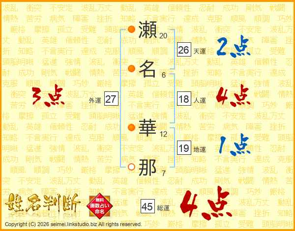 瀬(20画)名(6画) 華(12画)那(7画)