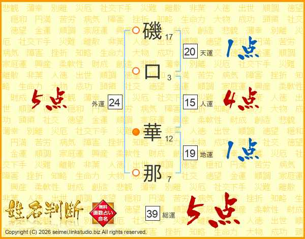磯口華那さんの総運は39画の5点!