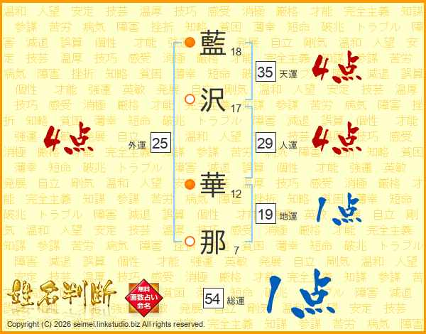 生活面を象徴する運勢です。外部から受ける影響力を表し、結婚運、家庭運や職場、環境への順応性を表します。総運から人運を引いた画数。姓や名が1文字の場合を除く。