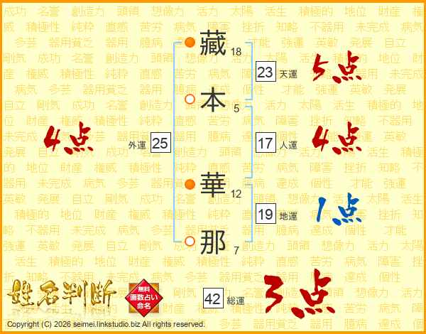 生活面を象徴する運勢です。外部から受ける影響力を表し、結婚運、家庭運や職場、環境への順応性を表します。総運から人運を引いた画数。姓や名が1文字の場合を除く。