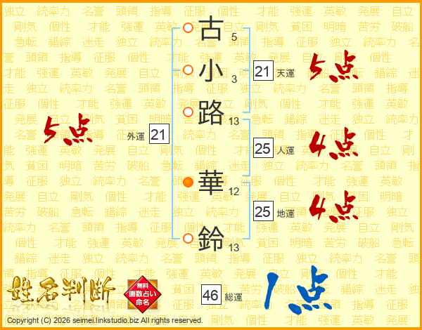 古(5画)小(3画)路(13画) 華(12画)鈴(13画)