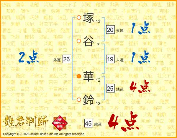 塚(13画)谷(7画) 華(12画)鈴(13画)