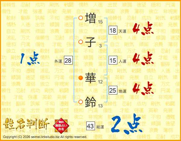 増(15画)子(3画) 華(12画)鈴(13画)