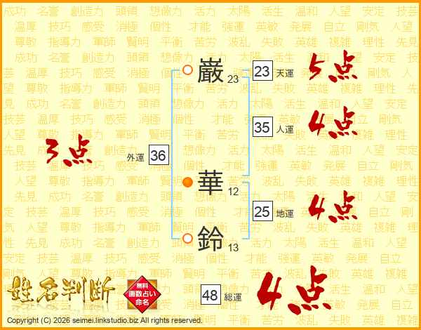 生活面を象徴する運勢です。外部から受ける影響力を表し、結婚運、家庭運や職場、環境への順応性を表します。総運から人運を引いた画数。姓や名が1文字の場合を除く。