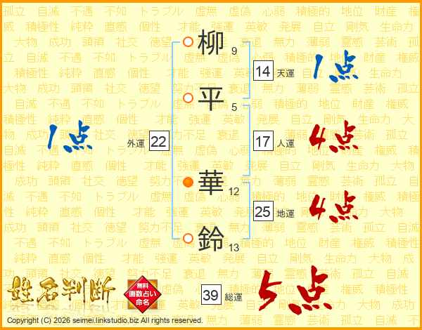 柳平華鈴さんの総運は39画の5点!