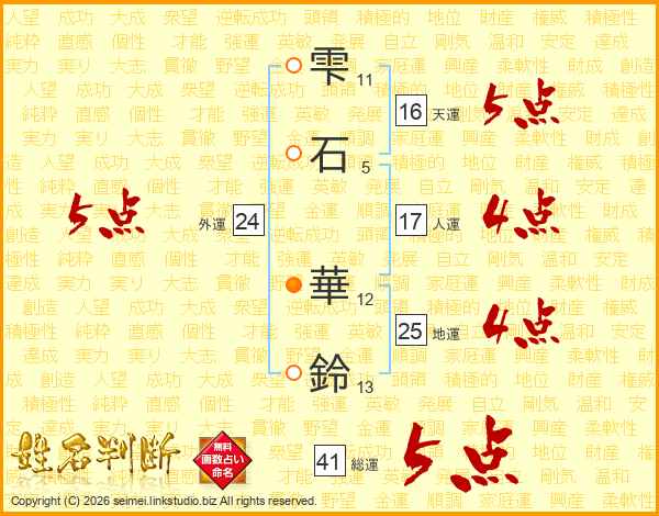 雫(11画)石(5画) 華(12画)鈴(13画)