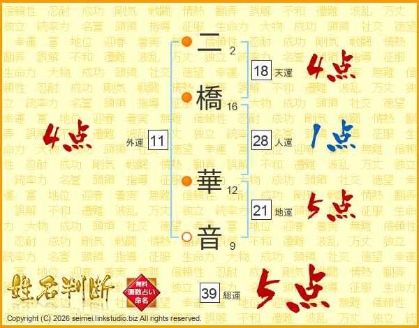 生活面を象徴する運勢です。外部から受ける影響力を表し、結婚運、家庭運や職場、環境への順応性を表します。総運から人運を引いた画数。姓や名が1文字の場合を除く。