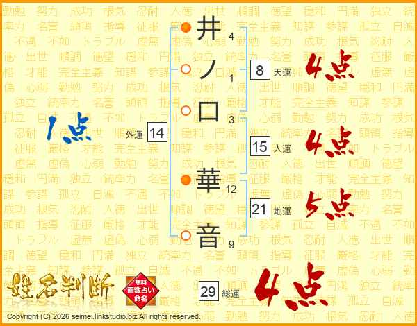 井(4画)ノ(1画)口(3画) 華(12画)音(9画)