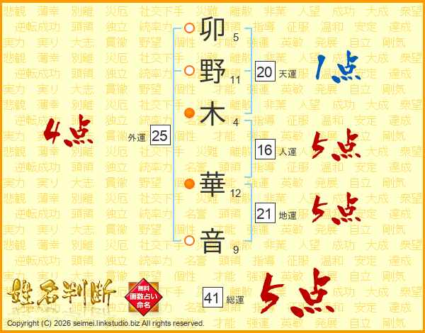 卯(5画)野(11画)木(4画) 華(12画)音(9画)