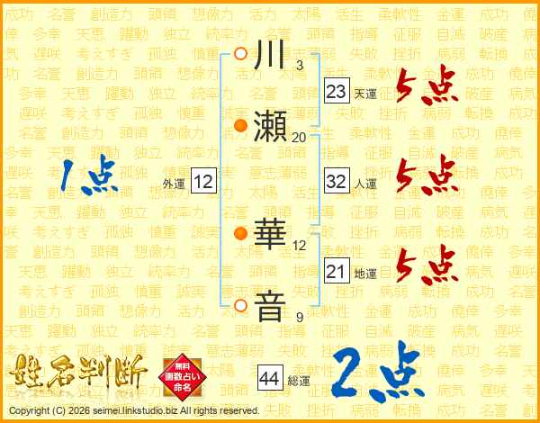 川瀬華音さんの総運は44画の2点!