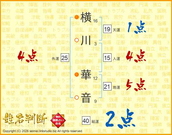 生活面を象徴する運勢です。外部から受ける影響力を表し、結婚運、家庭運や職場、環境への順応性を表します。総運から人運を引いた画数。姓や名が1文字の場合を除く。