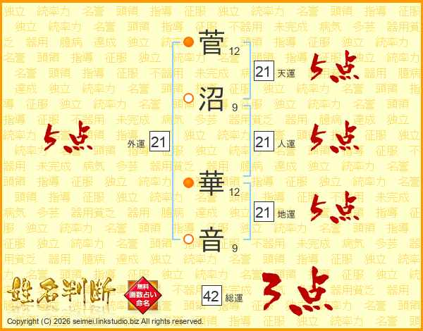 菅沼華音さんの天運は21画の5点!
