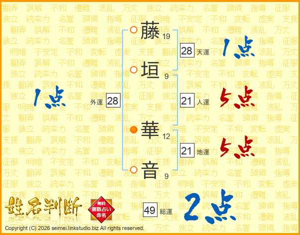 藤(19画)垣(9画) 華(12画)音(9画)