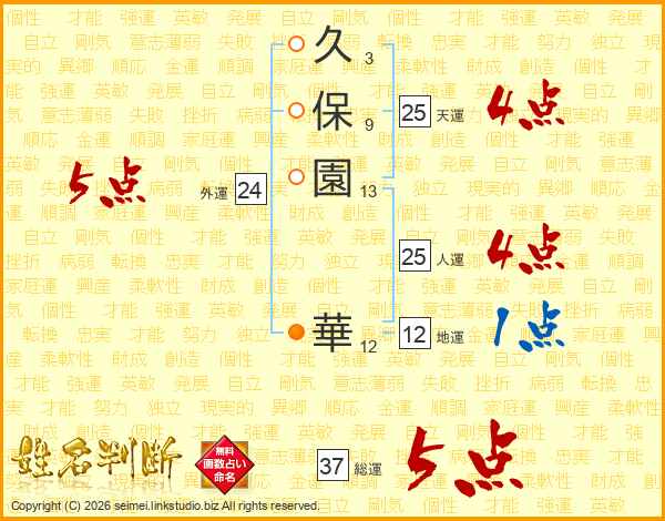生活面を象徴する運勢です。外部から受ける影響力を表し、結婚運、家庭運や職場、環境への順応性を表します。総運から人運を引いた画数。姓や名が1文字の場合を除く。