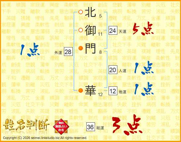 北(5画)御(11画)門(8画) 華(12画)
