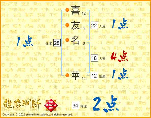 あなたの人生を表す1番重要な運勢です。生涯を通じて影響する総合運となり、主に50歳以降の晩年期に影響を及ぼします。苗字と名前の合計画数。