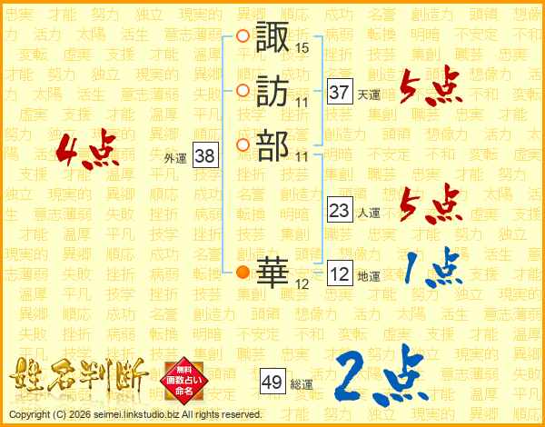 生活面を象徴する運勢です。外部から受ける影響力を表し、結婚運、家庭運や職場、環境への順応性を表します。総運から人運を引いた画数。姓や名が1文字の場合を除く。