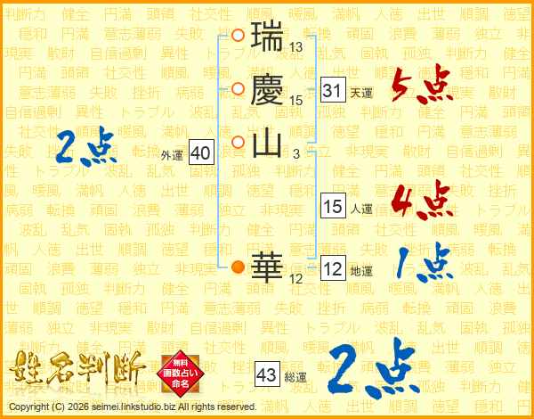 瑞(13画)慶(15画)山(3画) 華(12画)