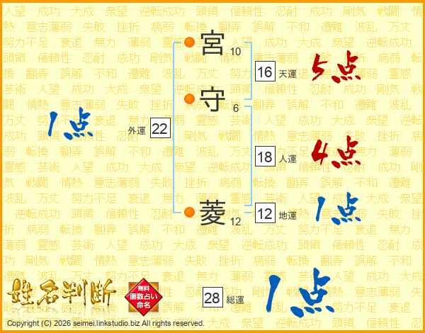 生活面を象徴する運勢です。外部から受ける影響力を表し、結婚運、家庭運や職場、環境への順応性を表します。総運から人運を引いた画数。姓や名が1文字の場合を除く。
