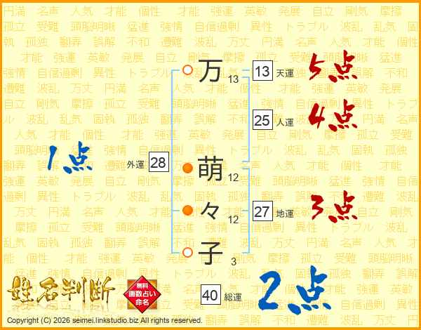 生活面を象徴する運勢です。外部から受ける影響力を表し、結婚運、家庭運や職場、環境への順応性を表します。総運から人運を引いた画数。姓や名が1文字の場合を除く。