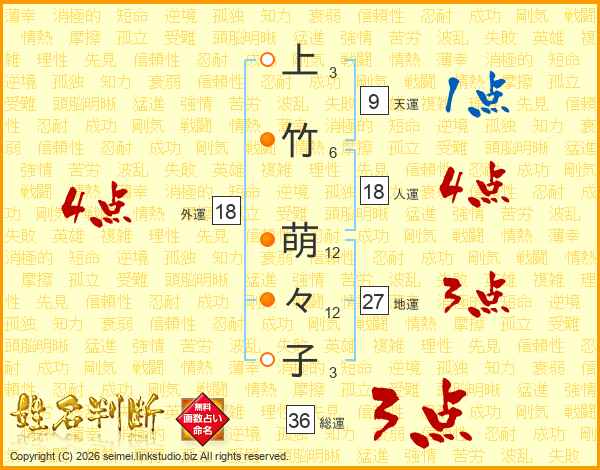 上(3画)竹(6画) 萌(12画)々(12画)子(3画)
