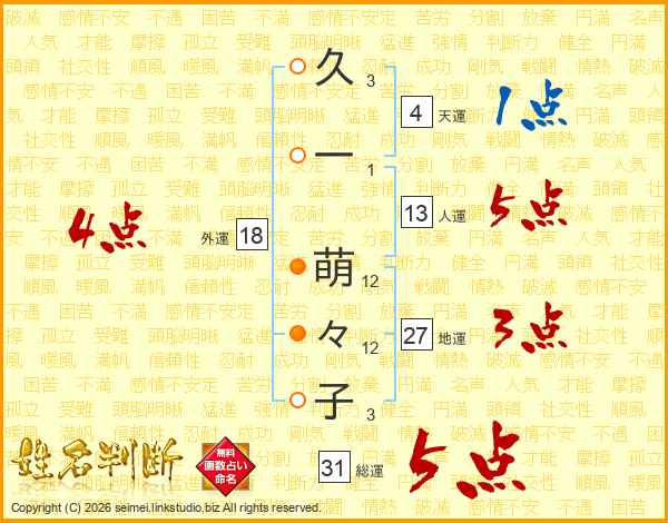 久(3画)一(1画) 萌(12画)々(12画)子(3画)