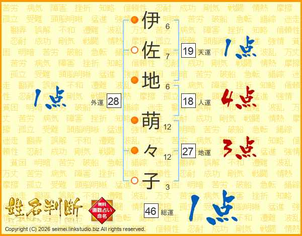 伊(6画)佐(7画)地(6画) 萌(12画)々(12画)子(3画)