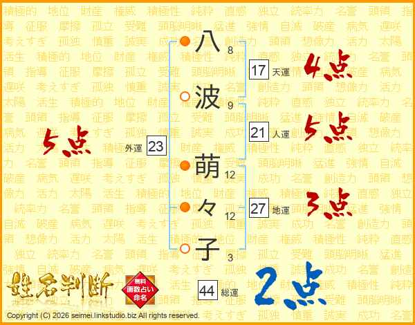 八(8画)波(9画) 萌(12画)々(12画)子(3画)