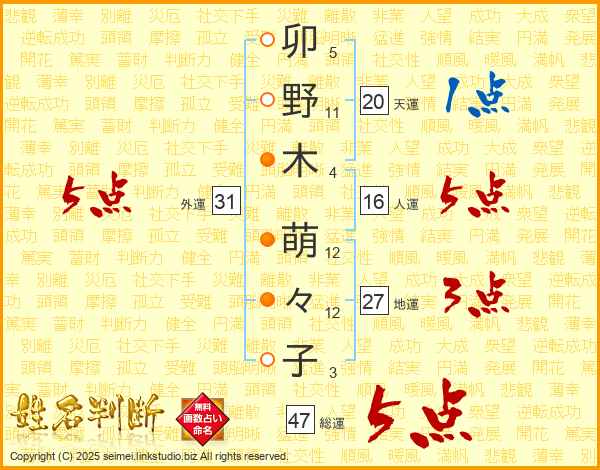 卯(5画)野(11画)木(4画) 萌(12画)々(12画)子(3画)