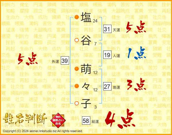 塩(24画)谷(7画) 萌(12画)々(12画)子(3画)