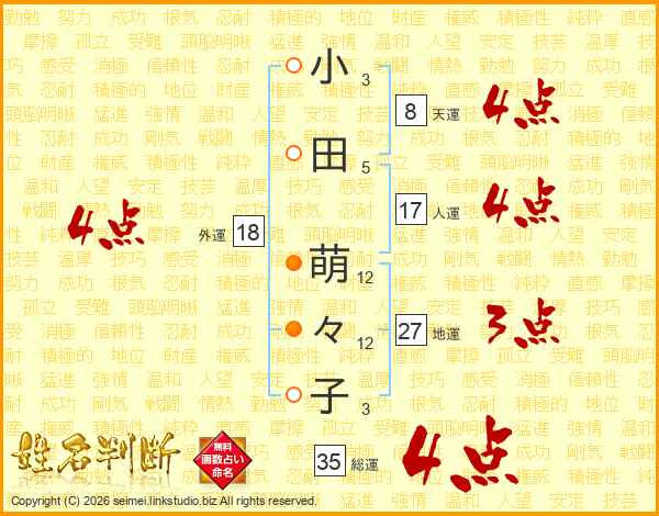 小(3画)田(5画) 萌(12画)々(12画)子(3画)