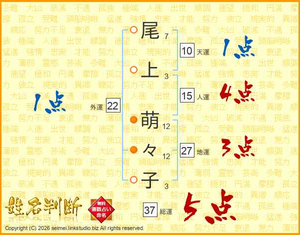 尾(7画)上(3画) 萌(12画)々(12画)子(3画)