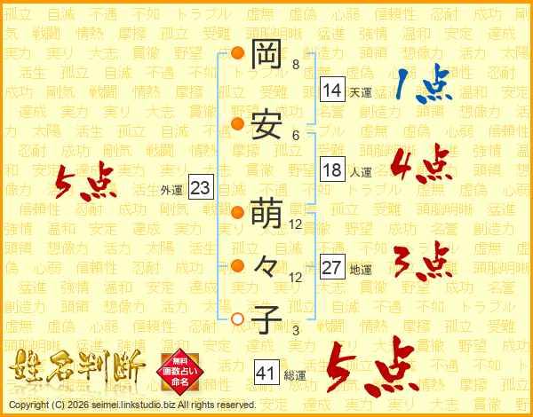 岡(8画)安(6画) 萌(12画)々(12画)子(3画)