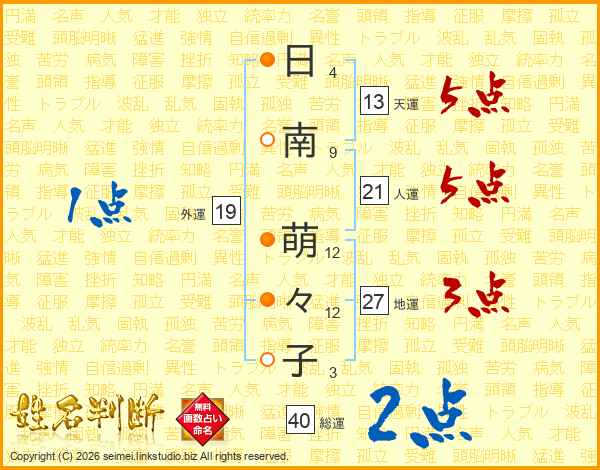日(4画)南(9画) 萌(12画)々(12画)子(3画)