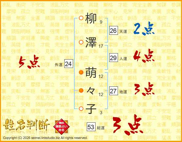 柳(9画)澤(17画) 萌(12画)々(12画)子(3画)