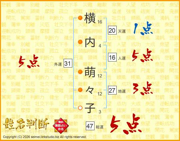 横内萌々子さんの総運は47画の5点!