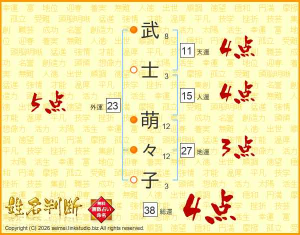 武(8画)士(3画) 萌(12画)々(12画)子(3画)