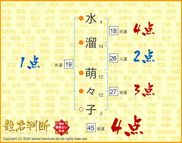 水(4画)溜(14画) 萌(12画)々(12画)子(3画)