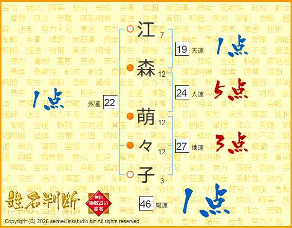 江(7画)森(12画) 萌(12画)々(12画)子(3画)
