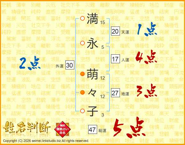 満(15画)永(5画) 萌(12画)々(12画)子(3画)