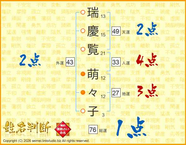 瑞(13画)慶(15画)覧(21画) 萌(12画)々(12画)子(3画)
