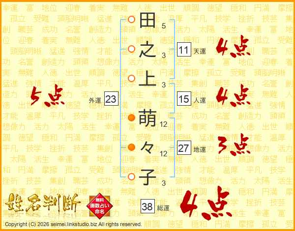 田(5画)之(3画)上(3画) 萌(12画)々(12画)子(3画)