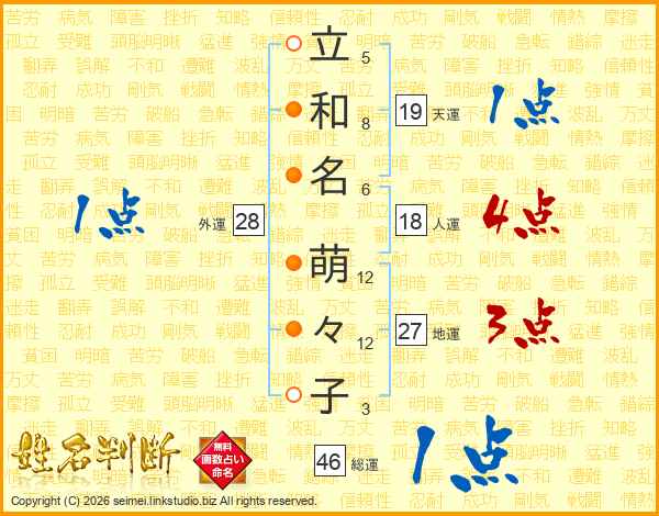 立(5画)和(8画)名(6画) 萌(12画)々(12画)子(3画)