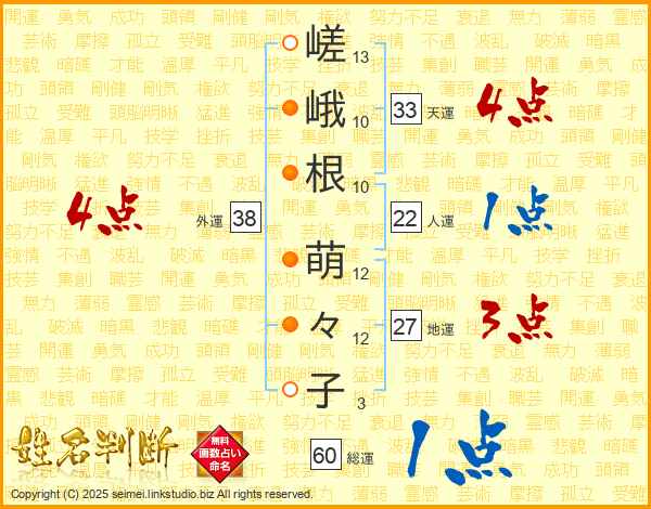 嵯(13画)峨(10画)根(10画) 萌(12画)々(12画)子(3画)