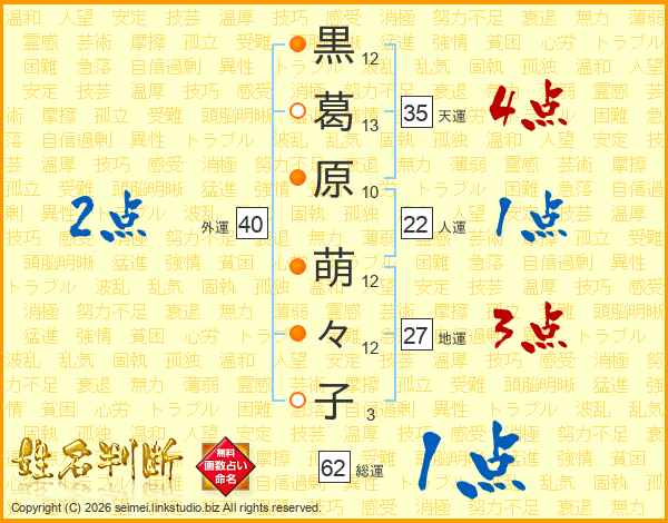 黒(12画)葛(13画)原(10画) 萌(12画)々(12画)子(3画)