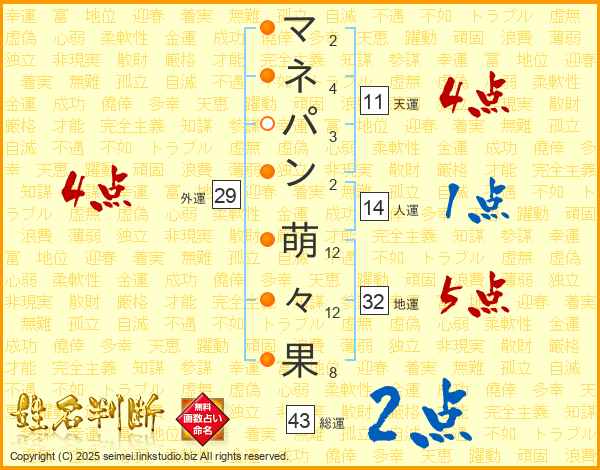 マ(2画)ネ(4画)パ(3画)ン(2画) 萌(12画)々(12画)果(8画)