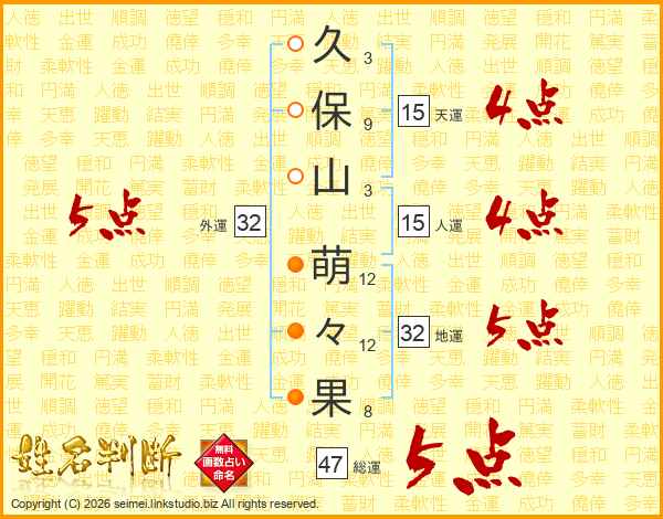 久(3画)保(9画)山(3画) 萌(12画)々(12画)果(8画)